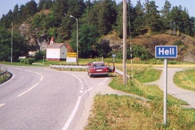 Believe information technology or not, the founders of this burg in southwestern Norway named it "Hell" later on the Old Norse give-and-take "hellir", which translates to "overhang" -- not the feeling you lot become from eating lutefisk.Fire in: Another place. Hell's one of the colder places in the world; in fact, it'southward actually frozen over a third of the yr. Blast, tish.